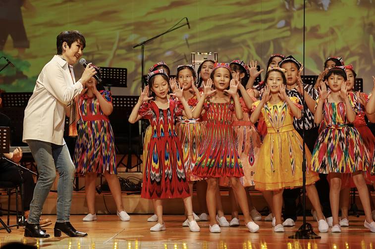 藝術(shù)家成方圓與身著美麗民族服裝的孩子們合唱《孤獨的牧羊人》