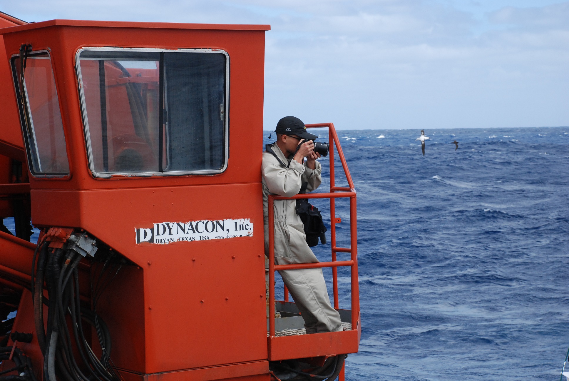 大洋一號船搭載著科考隊員在西南印度洋開展科考,作者登上船尾吊車記錄科考過程,遠(yuǎn)處的海鳥時刻注視著船邊泛起的浪花,那里時常有它們愛吃的飛魚一躍而出。