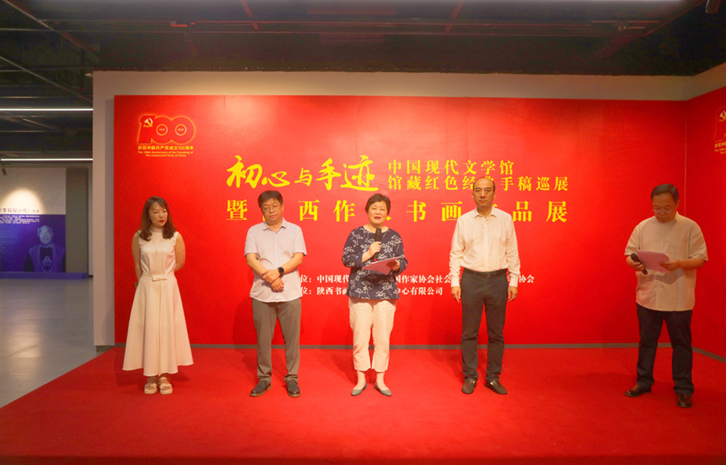 6月7日,由中國作協(xié)社會聯(lián)絡(luò)部、中國現(xiàn)代文學(xué)館、陜西省作家協(xié)會主辦,陜西書畫藝術(shù)品交易中心有限公司協(xié)辦的“初心與手跡——中國現(xiàn)代文學(xué)館館藏紅色經(jīng)典手稿巡展暨陜西作家書畫作品展”在西安開展。該展覽是“中國作家陜西文學(xué)周”的序曲和系列活動之一,旨在以展覽的形式慶祝中國共產(chǎn)黨百年華誕。開幕式由陜西省作家協(xié)會秘書長、機(jī)關(guān)黨委副書記王曉渭主持,陜西省作協(xié)工作人員、老干部、作家及文學(xué)愛好者在開幕式后參觀展覽。