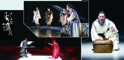 蒼涼的城墻在舞臺(tái)上斜立,一個(gè)孤獨(dú)幼小的靈魂悄然立于石階,他的吟唱,召喚出古老的“復(fù)仇”故事。程嬰、屠岸賈、程勃、公孫杵臼、公主等一眾人物定格于畫(huà)框之中,緩緩“移”向舞臺(tái),再次走入歷史的風(fēng)沙……