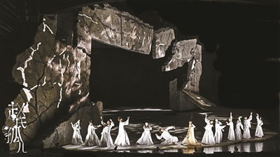 幾乎延伸到觀眾席里的仿石板砌“上場門”布景,在音樂劇《趙氏孤兒》上半場結(jié)束的時候幾乎全面崩塌,正是演到程嬰最接近萬念俱灰的時刻:韓厥、公孫杵臼與宮女先后為救趙家孤兒而死,他自己的孩子替換了孤兒,被屠岸賈刀劈身亡。在情感的維度里,他已經(jīng)失去了一切,唯一值得欣慰的是,遭到生死追殺的忠良之后得到保全,盡管復(fù)仇之日未知。