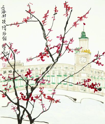 知名畫家楊正新的《上海郵政博物館》,有著傳統(tǒng)海派繪畫的筆墨意趣和生活氣息,又兼有現(xiàn)代繪畫的形式感和表現(xiàn)性。簡約的畫面準(zhǔn)確抽取了該建筑最靈動的輪廓線條及郵政綠色彩,將“遠(yuǎn)東第一大廳”的外墻橫跨了宣紙界面,隨形就勢勾勒出橋面。