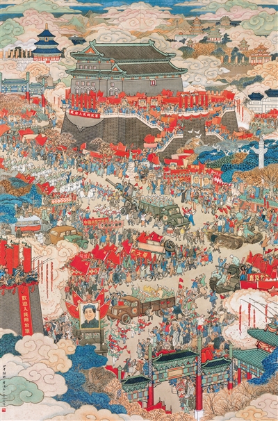 伴隨著解放戰(zhàn)爭走向勝利的鏗鏘步伐,一座座城市宣告解放,人民解放軍陸續(xù)舉行了盛大的入城式,展現(xiàn)其高昂的士氣,迎接新中國的誕生。與此同時(shí),出現(xiàn)了一批以解放軍入城式為主題的美術(shù)作品。新中國成立后,不少美術(shù)工作者持續(xù)從不同視角、以各種形式詮釋這一主題,其中以對(duì)北平、南京、上海三座城市歡慶解放的描繪最具代表性。