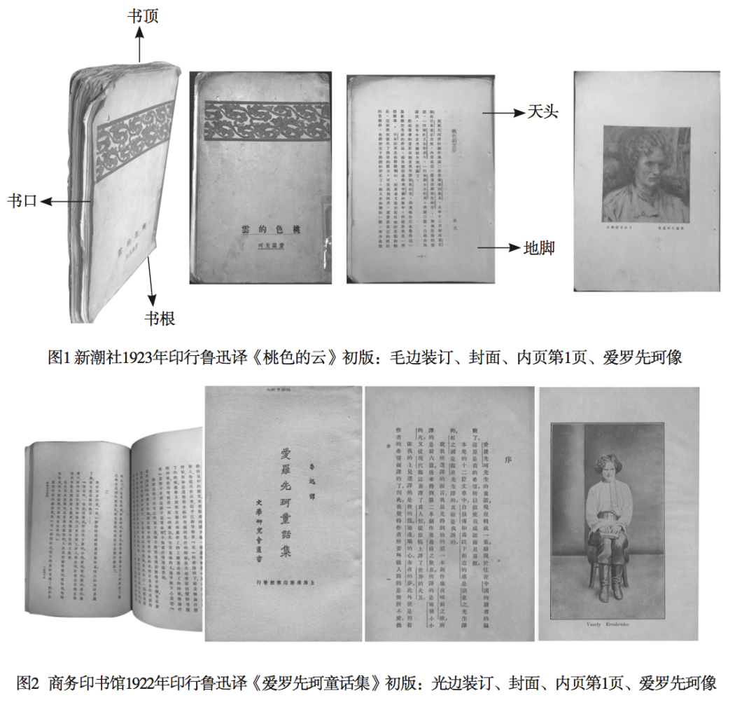 要達(dá)到最佳效果,“新潮社文藝叢書”毛邊本依靠的不僅是裝幀與版式設(shè)計(jì),同樣還需要令設(shè)計(jì)得以實(shí)現(xiàn)的物質(zhì)與技術(shù)基礎(chǔ)。可以說,“新潮社文藝叢書”利用了其時(shí)最精良的機(jī)械印刷條件。在紙墨方面,周氏兄弟留日時(shí)便已注意到歐式及日式毛邊本的封面多用皮革燙金或布面軟精裝,內(nèi)頁墨勻紙潔,編印《域外小說集》時(shí),就曾盡力模擬其質(zhì)感,用仿呢布質(zhì)地的厚羅紗紙做書面,用“上好洋紙”印本文,自謂“印的特別考究”6?!靶鲁鄙缥乃噮矔毖匾u此制,封面用仿布質(zhì)的重磅木造紙或布紋紙,插圖用銅版紙,內(nèi)文不再采用國內(nèi)通行的質(zhì)地脆弱、易氧化發(fā)黃的低價(jià)白報(bào)紙,而全部使用潔白光滑、不易變色、印字均勻的較高價(jià)道林紙。在印刷方面,“叢書”拼貼式地采用了其時(shí)最新穎的印刷技術(shù)。在同北京各印廠充分商討價(jià)格、理解技術(shù)后,李小峰等幾個(gè)新潮社員選定了京華印書局。作為商務(wù)印書館在北京設(shè)立的印刷所,1921年京華印書局大增設(shè)備后,躍升為北京30多處印廠中規(guī)模最大,技術(shù)最新,制版最精也是價(jià)格最昂貴的一個(gè)7。而魯迅為精益求精,又委托商務(wù)印書館上??倧S制三色版《桃色的云》作者像8。這里不妨與1922年商務(wù)印書館出版《愛羅先珂童話集》做一比較,同為愛羅先珂作品翻譯集,商務(wù)版作者像即為單色版照片,這是當(dāng)時(shí)文集插圖的標(biāo)配,三色版雖然清晰度高,但成本較單色或普通鋅版高出三倍至四倍,多用于畫冊、票鈔等,此前很少用于文集(《桃色的云》與《愛羅先珂童話集》形制對比見圖1、圖2)。