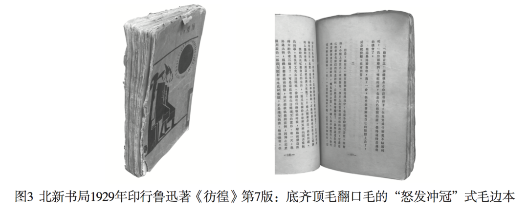其實(shí),《域外小說集》的三面毛邊、“新潮社文藝叢書”的書根書口毛邊是沿襲歐式及日式書裝的正統(tǒng)形式,而“怒發(fā)沖冠”式毛邊本卻是中國新文學(xué)出版自我實(shí)踐中的發(fā)明(“怒發(fā)沖冠”式毛邊本見圖3)。對于中式毛邊改制的原因,唐弢先生解釋為:“記得魯迅先生說過,洋裝書是直插的,用硬封面,毛邊在書根不受影響。中國尚沒有全用硬面精裝的條件。線裝書宜于橫放,向來的習(xí)慣是將書根磨光,寫上書名,以便隨時(shí)查閱。過去還有以寫書根為業(yè)的專門人才呢。何況舊式書箱很多是按橫放設(shè)計(jì)的,書根朝外,倘不加工,將只見到亂糟糟的一堆?!?9這是一個(gè)很有想象力的倒推:書籍被陳列、閱讀的方式反向影響了它被生產(chǎn)的樣式,“怒發(fā)沖冠”式毛邊切光書根是中國線裝書軟包造成的書籍橫放、書根向外露出習(xí)慣無意識(shí)的遺留,更值得玩味的是,我們就此抓住一只馬腳——看似創(chuàng)新的毛邊本,實(shí)則包含著線裝書使用習(xí)慣在洋裝書一隅的復(fù)活。那么,現(xiàn)代的毛邊書所繼承的是線裝書怎樣的形式經(jīng)驗(yàn)?