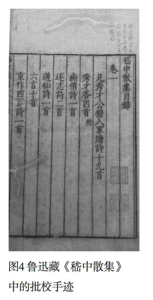 魯迅對《嵇康集》輯校甚精,此為魯迅所使用的底本之一,其校勘法即為在內(nèi)頁天頭以朱筆批注。冊頁見《圖4:魯迅藏〈嵇中散集〉中的批校頁》,圖像轉(zhuǎn)自北京魯迅博物館編、韋力撰《魯迅藏書志(古籍之部)》上,中華書局2016年版,彩頁第8頁。