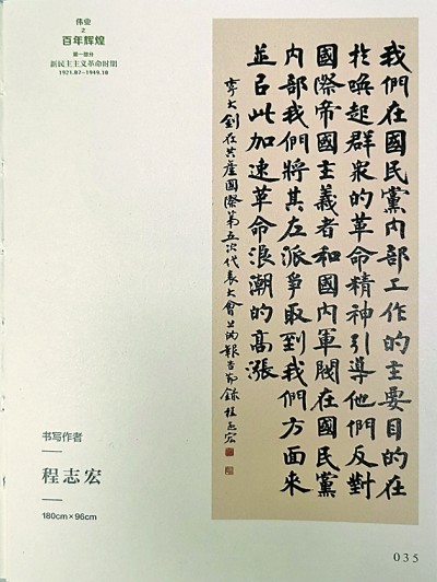 以長時段為線,以大事件為點,采用豐碑巨制的形式,記言錄史,紀(jì)事本末,這個篇章充分展示中國共產(chǎn)黨的重大決策和輝煌成就。153名書家濡墨揮毫新民主主義革命時期、社會主義革命和建設(shè)時期、改革開放和社會主義現(xiàn)代化建設(shè)新時期、中國特色社會主義新時代四個階段中與重大事件和偉大工程相關(guān)聯(lián)的黨史文獻、語錄、詩歌、手稿等,全景展現(xiàn)政治導(dǎo)向正確、史料真實可信、全民共賞的黨史華章。