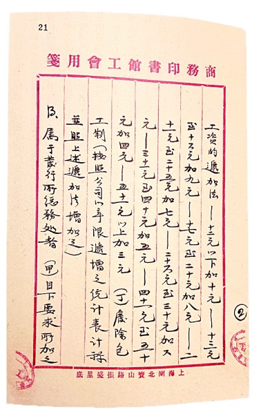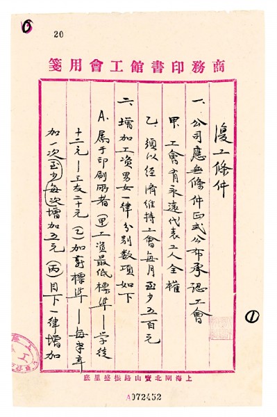 1925年8月,商務(wù)印書館爆發(fā)了“要求加薪及平等待遇大同盟罷工”。8月24日,13位職工代表舉行聯(lián)席會議,商訂復(fù)工條件,沈雁冰負責(zé)執(zhí)筆起草談判文件,在會議當(dāng)場寫成了這份《復(fù)工條件》。《復(fù)工條件》包括“公司應(yīng)無條件正式公布承認工會”“增加工資”“減短每日工作時間”等九項內(nèi)容。