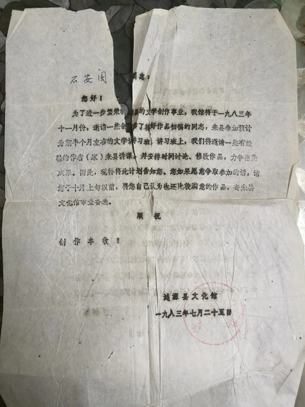 1983年底的這次文學(xué)講習(xí)班事先有一個預(yù)通知。農(nóng)民業(yè)余作者石安國向筆者展示了他收藏至今的參會通知。通知以鉛字印刷,全文如下: