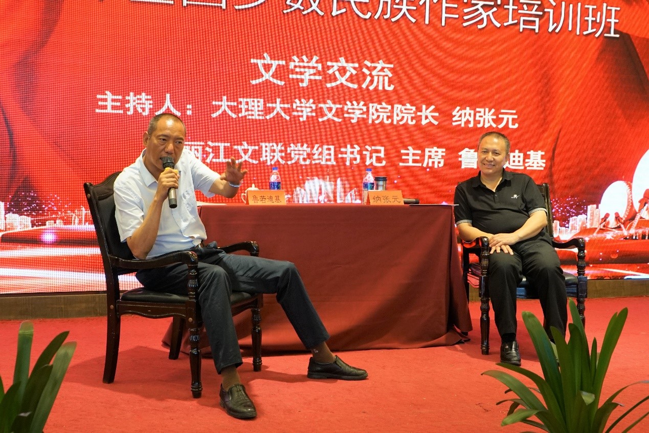 培訓(xùn)班期間,還舉辦了一場名家對談,麗江市文聯(lián)黨組書記、主席魯若迪基與大理大學(xué)文學(xué)院院長納張元兩位少數(shù)民族作家基于自身創(chuàng)作,對少數(shù)民族文學(xué)的創(chuàng)作空間展開了探討。魯若迪基以自己的詩《1958年》開篇,講述了對少數(shù)民族文學(xué)的整體看法。他認(rèn)為,新中國成立后,在黨的領(lǐng)導(dǎo)下,瀕臨滅絕的少數(shù)民族口傳文學(xué)得到了搶救和保護,少數(shù)民族作家也開始拿起筆來撰寫自己民族的故事。他很關(guān)注近些年的脫貧攻堅文學(xué)創(chuàng)作,認(rèn)為少數(shù)民族文學(xué)創(chuàng)作要深入生活,挖掘和書寫本民族靈魂深處的東西;同時也要向外探測,開拓新的創(chuàng)作領(lǐng)域。納張元則認(rèn)為,為民族代言,為民族立傳,幾乎是每一個少數(shù)民族作家與生俱來的創(chuàng)作理想和創(chuàng)作使命。我們敬重這種責(zé)任意識和擔(dān)當(dāng)精神,同時文學(xué)創(chuàng)作具有特殊性,好作品也需要充分彰顯作家的個性,作家的獨特個性是作品騰飛的翅膀。