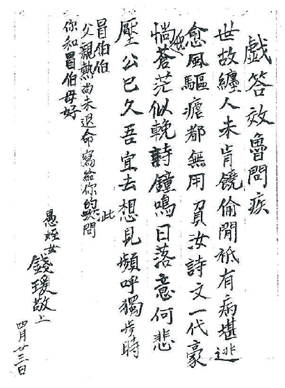 病院中駭悉叔子噩耗。去夏一晤,永隔人天。追思平生交誼,不勝悲愴。未克赴吊,更深疚歉。春節(jié)返舍以來,賤體仍未痊愈,而內(nèi)人又患病,衰疾相乘,缺于函候,忽奉手書,敬悉一是。題簽遵命寫如別紙。倘不合用,便棄擲可也。