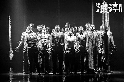現(xiàn)代舞語匯也是烘托這個意象空間的重要元素。不同于當(dāng)下戲劇中常看到的歌(舞)隊形式,《浪潮》的群舞演員并不直接參與情節(jié)、點評情節(jié),他們僅僅通過肢體來凸顯浪潮這一意象,烘托詩意。浪潮是不同形態(tài)的,全劇開場,是眾多同志被槍殺的刑場,演員們平躺在水舞臺上,伴隨著旁白,槍聲響起,演員們以整齊而夸張的形體律動代表著被槍殺一瞬的人們,痛苦的喘氣聲、掙扎著的軀干,由分散向中心匯聚,是對處于低迷狀態(tài)的革命者形象化的表現(xiàn)。而待到高潮段落,當(dāng)“五烈士”的魂靈找到了死亡的答案,他們無悔于自己死于青春、死于少年,舞臺上奔跑的人們讓水花飛濺,浪潮奔騰,一浪高過一浪,舞蹈演員被托舉的肢體恣意在人群之間傳遞翻滾。