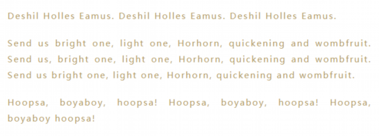 劉象愚先生如何體現(xiàn)這種文體的演變呢?他認(rèn)為:該章節(jié)前三小段戲仿古羅馬阿瓦爾兄弟會(huì)祈禱繁殖女神賜予豐年的禱詞。無(wú)論就內(nèi)容還是文體而言,都是本章的一個(gè)總綱。阿瓦爾兄弟會(huì)的禱詞形成于公元3世紀(jì),是一種頌詩(shī)體。這里每小段三句呼喊(從“右出至赫利斯”至“好哇!”)。