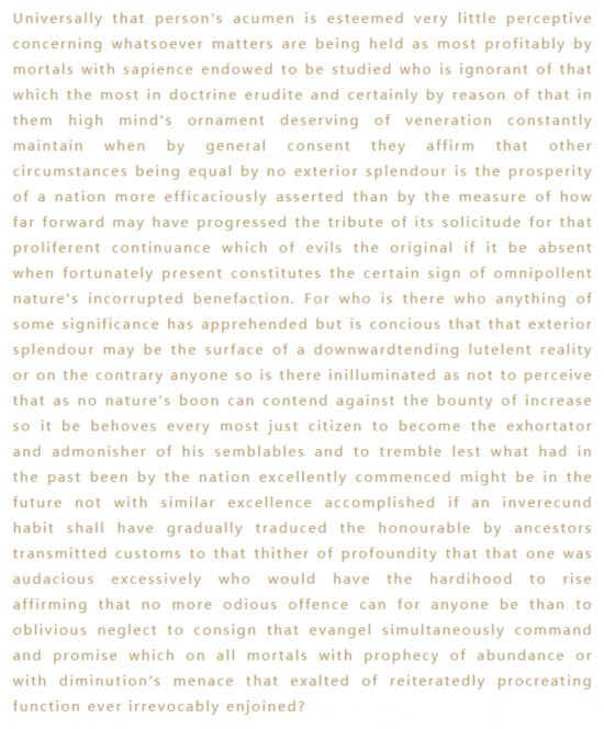第四段是沒(méi)有標(biāo)點(diǎn)的原文,劉象愚先生試圖貼合喬伊斯原文的風(fēng)貌,于是采用了佶屈聱牙的文言文。劉象愚先生認(rèn)為:“這段文字喬伊斯的初衷是戲仿羅馬歷史家薩盧斯特和塔西陀的拉丁文譯文。但后來(lái)覺(jué)得這兩位羅馬作家的文體本以簡(jiǎn)明見(jiàn)長(zhǎng),與他要模擬卵子受孕前與胚胎剛剛形成時(shí)期的混沌狀態(tài)并不十分貼合,也不符合現(xiàn)代英語(yǔ)開(kāi)始形成演化之前那種拉丁化句式中拉丁語(yǔ)、愛(ài)爾蘭語(yǔ)與其他多種語(yǔ)言混雜的形態(tài),因此在修訂清樣時(shí)又做了不少修改。這樣,最終定稿的這段文字中的兩句就成了一定程度上不倫不類的樣式,既非典型的早期拉丁文體,也非好的英譯文體,不僅句子長(zhǎng),中間不點(diǎn)斷,而且句式紊亂,很難清晰地解析,特別是第一句(Universally ……benefaction.),語(yǔ)義和結(jié)構(gòu)相當(dāng)混亂,所以著名喬學(xué)家斯圖爾特·吉爾伯特說(shuō),這是一個(gè)‘令人驚駭?shù)木渥印╝ppalling sentence)。那么,這段文字怎么譯?依照大意,將長(zhǎng)句點(diǎn)斷,轉(zhuǎn)換成十分清晰、簡(jiǎn)明的漢語(yǔ)顯然不符合喬伊斯的本意。竊以為,這里至少要考慮以下兩個(gè)因素:從歷史的線索看,要盡量用漢語(yǔ)史上的早期文字和語(yǔ)言風(fēng)格;從內(nèi)容和形式的角度看,不可譯成明晰的文體?;诖?,拙譯參酌漢語(yǔ)史上早期的書(shū)經(jīng)體,雜湊旬、韓諸子的議論文體,基本保留原來(lái)的兩長(zhǎng)句和原結(jié)構(gòu),不點(diǎn)斷,盡量不調(diào)整語(yǔ)序,不令語(yǔ)義十分明確:只給出大意,強(qiáng)調(diào)其中講到的‘生殖繁衍’、‘生殖功能’(procreating function)之類的重要性?!?/p>