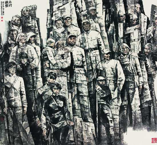 《太行鐵壁》借助傳統(tǒng)國(guó)畫(huà)技法與當(dāng)代壁畫(huà)表現(xiàn)手段,充分表現(xiàn)出中國(guó)軍民以堅(jiān)不可摧的斗志同仇敵愾、共御外辱的革命風(fēng)范。該作描繪的軍民形象既有中國(guó)共產(chǎn)黨的高級(jí)將領(lǐng),又有眾多普通將士和民眾。作者采用了將頗具個(gè)性風(fēng)采的人物造型與太行山勢(shì)融為一體的藝術(shù)手法,于壁立千仞的山脈中勾勒眾多可歌可泣的典型形象。朱德、彭德懷等高級(jí)將領(lǐng)和眾多無(wú)名英雄匯合在一起,和高聳巍峨的太行山同化為剛強(qiáng)挺拔的抗戰(zhàn)“長(zhǎng)城”,構(gòu)建出一種不是浮雕勝似浮雕的美學(xué)意境。在這種紀(jì)念碑式的構(gòu)圖中,人物依山就勢(shì)地縱向組合成錯(cuò)落有致的行列,橫向間又彼此遙相呼應(yīng)、關(guān)聯(lián)密切。畫(huà)面中,朱德處于中心,其形體于挺括之間盡顯質(zhì)樸平實(shí)的風(fēng)格特征。立于他身前的是彭德懷、劉伯承、鄧小平,均側(cè)向左前方,從鄧小平緊閉的雙唇和左手插于褲袋的姿態(tài),可見(jiàn)其內(nèi)心的強(qiáng)大和堅(jiān)韌。彭德懷腳下則踏著一塊巨石,表現(xiàn)出其偉岸高大的形象。這幅畫(huà)融合中西繪畫(huà)技巧,將寫(xiě)實(shí)造型手法、傳統(tǒng)水墨寫(xiě)意與立體主義語(yǔ)言有機(jī)統(tǒng)一,成為太行軍民抗日的豐碑。