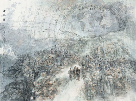 2017年初,中國國家畫院承辦的“一帶一路國際美術(shù)創(chuàng)作工程”公布了首批入選的選題名單,廣交會沒有在其中。彼時,我正在創(chuàng)作廣東省美協(xié)委托的以“改革開放40周年”為主題的廣交會作品。方土意識到“廣交會”是一個很重要的題材,特別是對于廣東來說意義非凡,同時也十分適合用中國畫來表現(xiàn)。廣交會是新中國成立后重開海上絲綢之路的新起點,是傳統(tǒng)海上絲綢之路的再延續(xù)、新海上絲綢之路的發(fā)端,是我國對外貿(mào)易的“晴雨表”和“風(fēng)向標(biāo)”,見證了中國走向世界的歷史進(jìn)程。