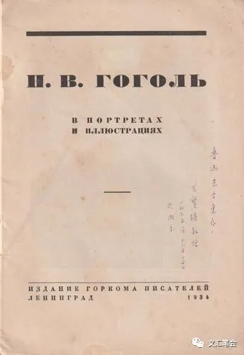 封面書名下的正中間,是一幀果戈理的黑色肖像剪影,他的鼻子挺拔,面容飽滿,富有精神。下面印著果戈理的俄文簽名手跡。然后是“彼得堡作家市委會出版于列寧格勒1934”字樣。