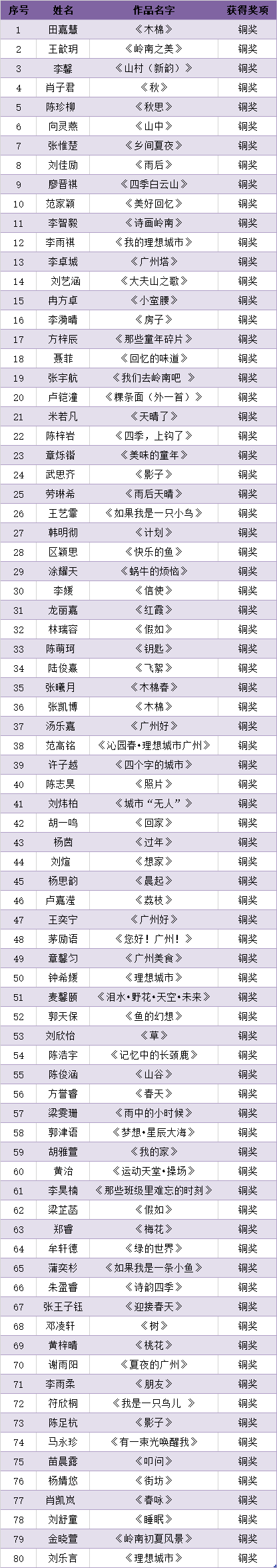 首屆珠江兒童詩歌獎(jiǎng)以“理想城市”“美好回憶”“嶺南風(fēng)物”為主題,廣泛向國(guó)內(nèi)16歲以內(nèi)的少年兒童征集現(xiàn)代詩和舊體詩。截止2021年6月1日,共收到參賽作品700多件。經(jīng)評(píng)委初評(píng),共有170個(gè)作品進(jìn)入復(fù)選(網(wǎng)絡(luò)票選)。最終,結(jié)合網(wǎng)絡(luò)票選結(jié)果和評(píng)委意見,終評(píng)出金獎(jiǎng)20名、銀獎(jiǎng)50名、銅獎(jiǎng)80名、網(wǎng)絡(luò)最佳人氣獎(jiǎng)20名。