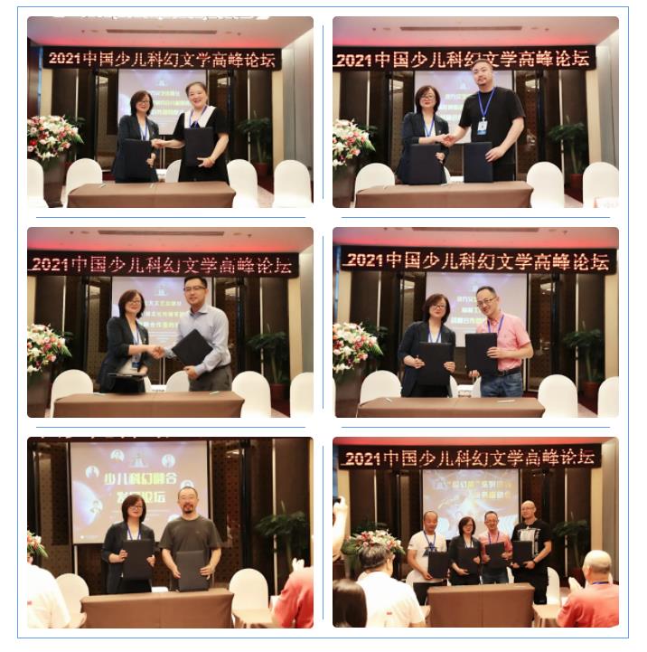 論壇上,北方文藝出版社與中國兒童文學(xué)研究會兒童劇委員會、成都萌寵神番動漫制作有限公司、成都聲娛文化傳播有限公司、陸楊工作室等機構(gòu)簽訂戰(zhàn)略合作協(xié)議,并就“超幻俠”系列等重點少兒科幻作品進行現(xiàn)場簽約;會上同時成立了“北方文藝出版社少兒科幻、科普作家培養(yǎng)基地”,并就成立“全國少兒科幻文學(xué)作家聯(lián)盟”探討了相關(guān)事宜。