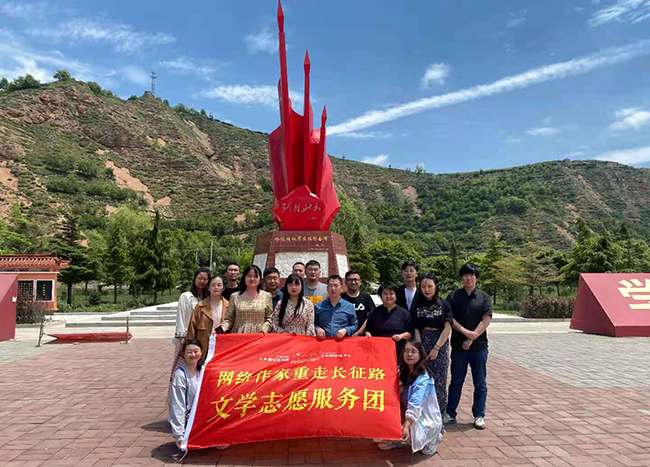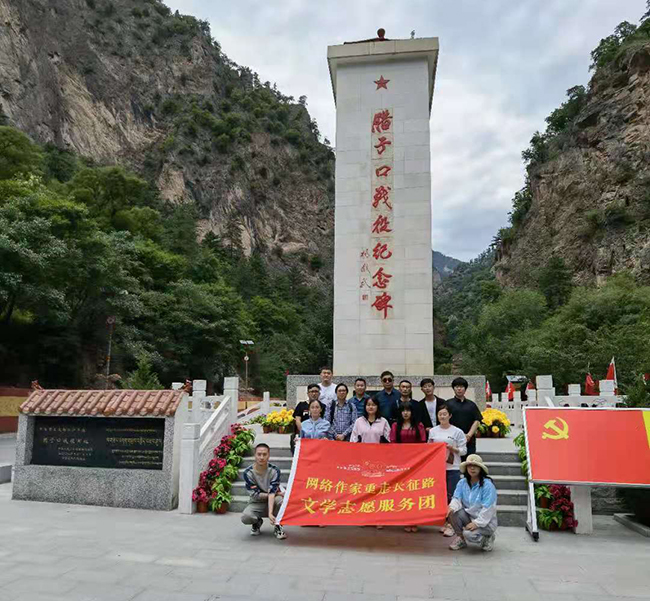 網(wǎng)絡(luò)作家重走長征路文學(xué)志愿服務(wù)團(tuán)在臘子口戰(zhàn)役紀(jì)念碑前合影
