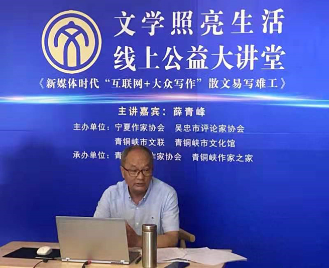 6月27日上午,為迎接中國共產(chǎn)黨100歲華誕,貫徹落實習(xí)近平總書記關(guān)于文藝工作的重要論述,發(fā)揮文藝工作者以文化人、以文育人的優(yōu)勢,由寧夏作家協(xié)會、吳忠市文藝評論家協(xié)會、青銅峽市文聯(lián)、青銅峽市文化館主辦,青銅峽市作家協(xié)會、青銅峽作家之家創(chuàng)研培訓(xùn)基地承辦的“文學(xué)照亮生活”線上線下公益大講堂在青銅峽作家之家成功舉辦。寧夏作家協(xié)會副秘書長張濤主持并致辭。國家二級作家、寧夏理工學(xué)院副教授、石嘴山市文藝評論家協(xié)會主席薛青峰受邀擔(dān)任主講嘉賓。