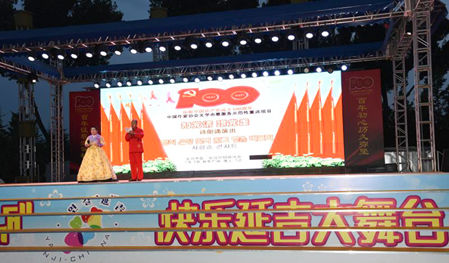 為慶祝中國共產(chǎn)黨成立100周年,學(xué)習(xí)貫徹習(xí)近平總書記“七一”重要講話精神,激發(fā)奮進(jìn)力量,7月7日晚,中國作家協(xié)會2021年文學(xué)志愿服務(wù)示范性重點(diǎn)扶持項(xiàng)目——“知黨情 跟黨走”詩歌朗誦演出在延吉青年廣場“延吉快樂大舞臺”舉行。延邊詩朗誦協(xié)會詩歌朗誦藝術(shù)家及詩朗誦愛好者、延邊大學(xué)學(xué)生等70多人參加詩歌朗誦演出,為廣大市民獻(xiàn)上一場文學(xué)盛宴。