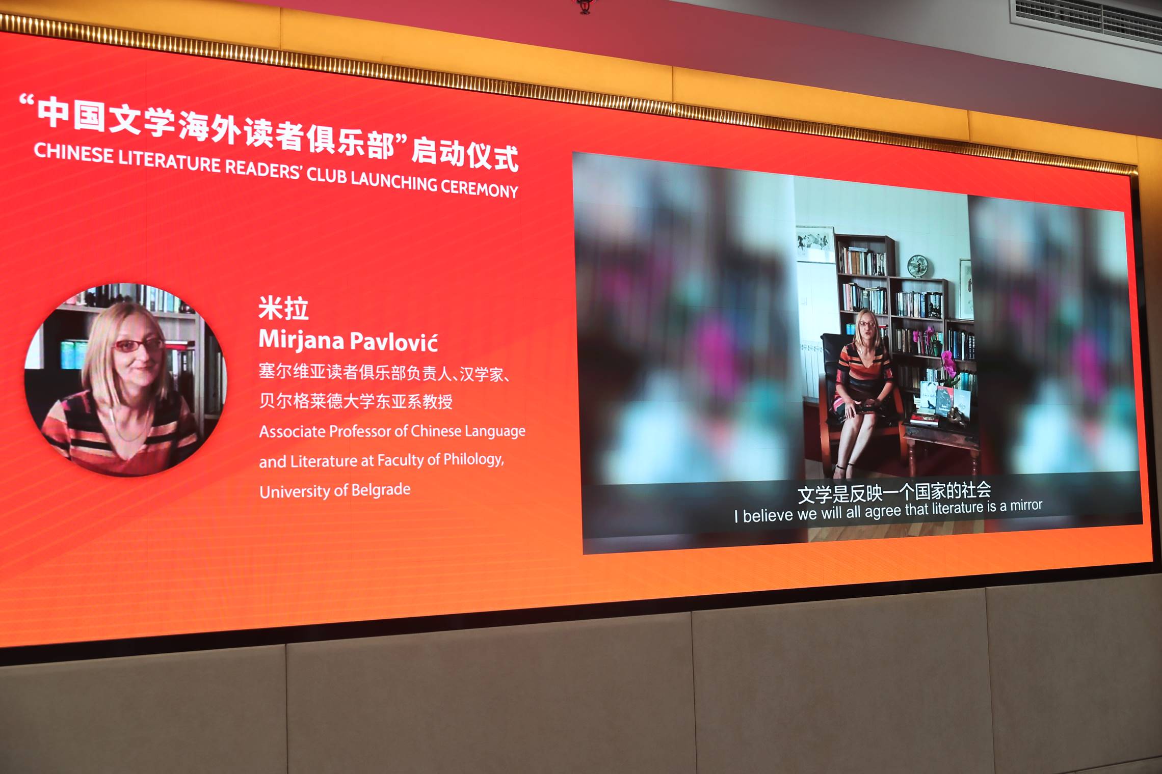 塞爾維亞讀者俱樂(lè)部負(fù)責(zé)人米拉(米爾婭娜?帕芙洛維奇)是塞爾維亞貝爾格萊德大學(xué)東亞系教授,主要講授中國(guó)當(dāng)代文學(xué)和漢語(yǔ)-塞語(yǔ)翻譯。她在視頻發(fā)言中提到,文學(xué)作為反映一個(gè)國(guó)家社會(huì)和文化的鏡子,在了解其他國(guó)家的歷史、社會(huì)與文化方面一直發(fā)揮著重要作用?!爸袊?guó)文學(xué)海外讀者俱樂(lè)部”的建立,將有助于對(duì)中國(guó)文學(xué)作品有著濃厚興趣的塞爾維亞讀者更好地了解喜愛(ài)的作家,這種跨文化對(duì)話必將加深中塞兩國(guó)之間的友誼。