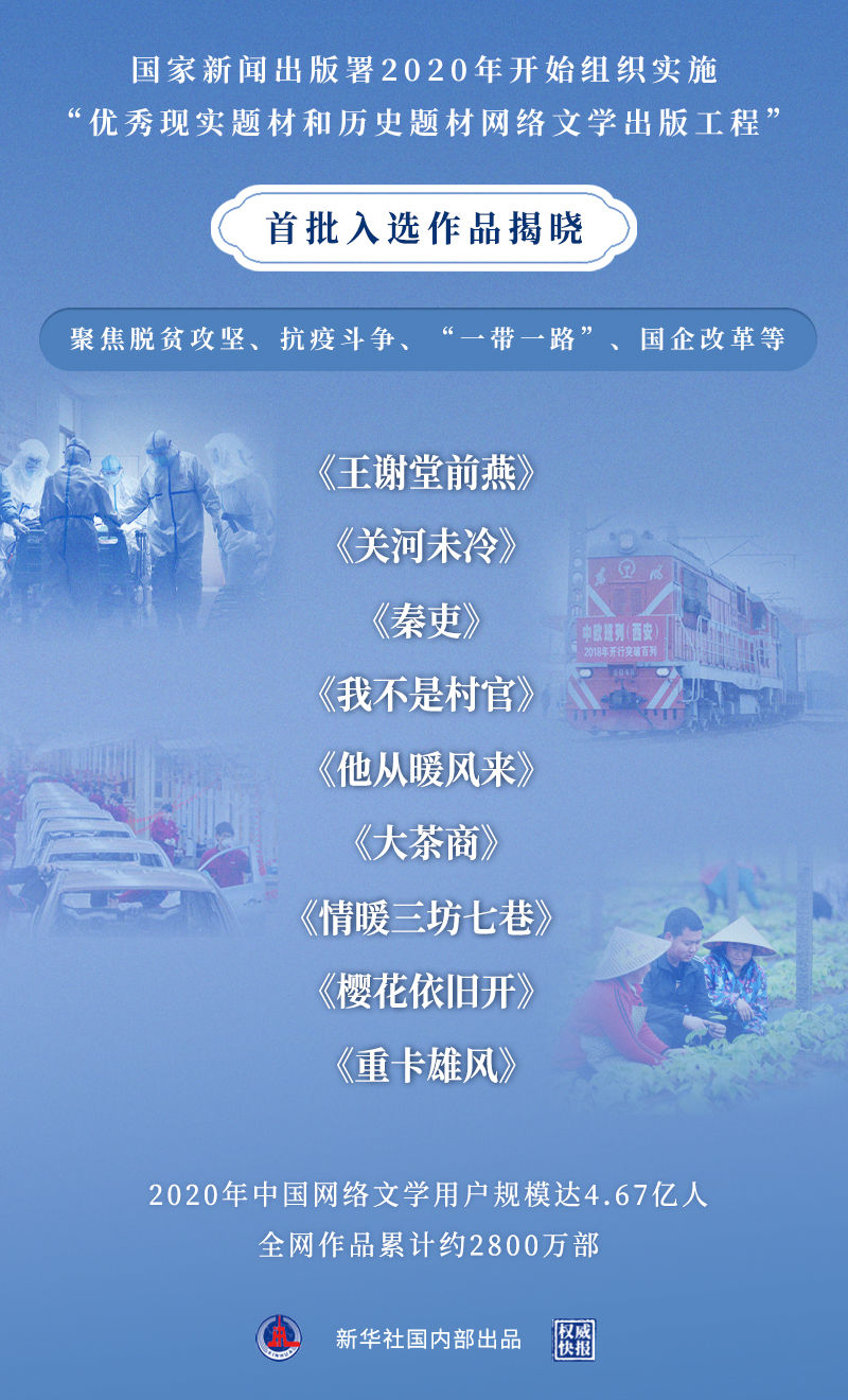 8月23日,國家新聞出版署組織的2020年“優(yōu)秀現(xiàn)實題材和歷史題材網(wǎng)絡(luò)文學(xué)出版工程”入選作品揭曉,《王謝堂前燕》《關(guān)河未冷》《秦吏》《我不是村官》《他從暖風(fēng)來》《大茶商》《情暖三坊七巷》《櫻花依舊開》《重卡雄風(fēng)》9部作品入選。