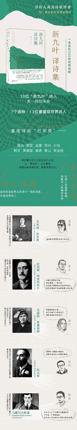 《新九葉·譯詩集》翻譯了13位殿堂級世界詩人的詩作,這些詩作涉及英語、法語、葡語、瑞典語等7個語種。詩集中收錄的外國詩人均為近200年來各國享譽詩壇的代表人物,包括葡語象征主義詩人佩索阿、庇山耶,美國詩人艾米莉·狄金森、阿什貝利,法語詩人桑德拉爾、瓦雷里、阿波利奈爾、馬克斯·雅科布,丹麥當代女詩人琵雅·塔夫德魯普,集哲學家、劇作家、外交家于一身的羅馬尼亞詩人布拉加,芬蘭瑞典語國民女詩人索德格朗,秘魯最重要的詩人巴列霍,俄國詩歌未來主義創(chuàng)立者馬雅可夫斯基等,旨在致敬世界詩壇,讓讀者感受世界詩歌的魅力的同時,也能夠激發(fā)漢語詩歌的創(chuàng)作。