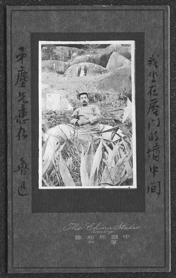 1927年1月2日攝于廈門。魯迅對廈門大學的人際關系感到厭煩,且不適應當?shù)厣睿蛔惆肽昃蜎Q意離開。臨行前,魯迅、林語堂與幾個學生在南普陀寺西南的小山崗上照相,這里到處生長著魯迅喜愛的龍舌蘭,滿山是饅頭一樣的洋灰的墳墓。魯迅寫信給許廣平說:“今天照了一個照相,是在草木叢中,坐在一個洋灰的墳的祭桌上”。魯迅后來把照片用在雜文集《墳》中。他還在照片上題寫“我坐在廈門的墳中間”贈給章廷謙(矛塵)。照片上標有:The China Studio, Amoy(廈門中國照相館)。