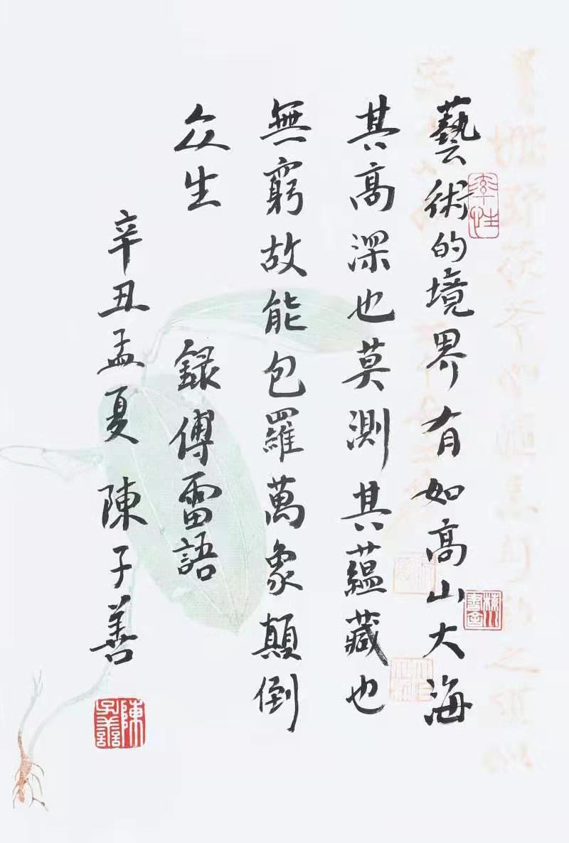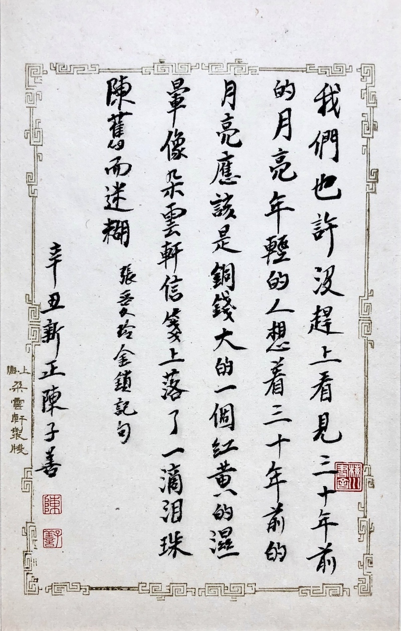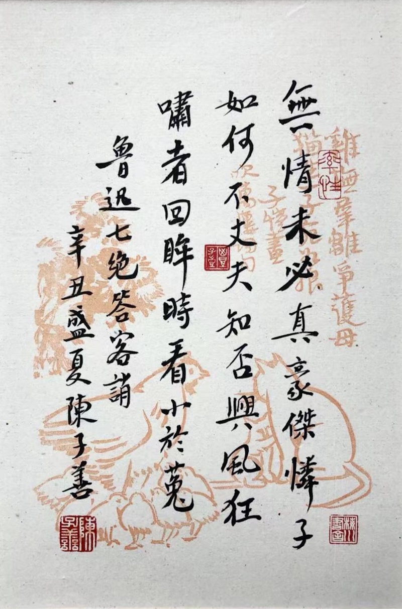 他帶給我們的最新驚喜,是這個(gè)世界上竟然會(huì)有一個(gè)“陳子善教授手錄新文學(xué)經(jīng)典墨跡展”。但這次的驚喜又和以往有所不同,它以“出圈的節(jié)奏”挑戰(zhàn)了我對(duì)陳老師才能的想象力。陳老師怕我驚喜得找不著方向,就在微信里介紹說(shuō):“我這墨跡展,字不怎么樣,但自以為獨(dú)創(chuàng)一格的,是我只寫(xiě)新文學(xué)名家的名言雋語(yǔ),計(jì)有魯迅、胡適、周作人、郁達(dá)夫、徐志摩、梁實(shí)秋、林語(yǔ)堂、巴金、豐子愷、傅雷、張愛(ài)玲、木心等十二家的詩(shī)、對(duì)聯(lián)和警句。這是從未有過(guò)的,而且這些人也都是我研究過(guò)的……”我不禁揣想:陳老師對(duì)現(xiàn)代文學(xué)中這些人物星辰的感情究竟有多深不可測(cè)呢?他為這些人和書(shū)和文章以及與之有關(guān)的人和書(shū)和文章,獻(xiàn)了白天獻(xiàn)夜晚,獻(xiàn)了朝陽(yáng)獻(xiàn)夕陽(yáng),獻(xiàn)了簡(jiǎn)體獻(xiàn)繁體,獻(xiàn)了工作獻(xiàn)退休?,F(xiàn)在,又把墨跡獻(xiàn)出來(lái)了。