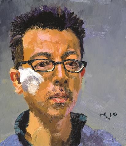 畫《小帥》時(shí),北京正值桃花盛開的清明時(shí)節(jié),畫中的王小帥坐在工作室陽臺上,面對著地上的巨大火盆,隨著炭火的溫度一點(diǎn)一點(diǎn)升高,早年一起拍電影的點(diǎn)滴往事仿佛也在此刻回溫。這對老友一起從青年步入中年,他們的兒女也已成長到了當(dāng)時(shí)兩人相識的年紀(jì),生命在平凡的日子中開啟了新的輪回。