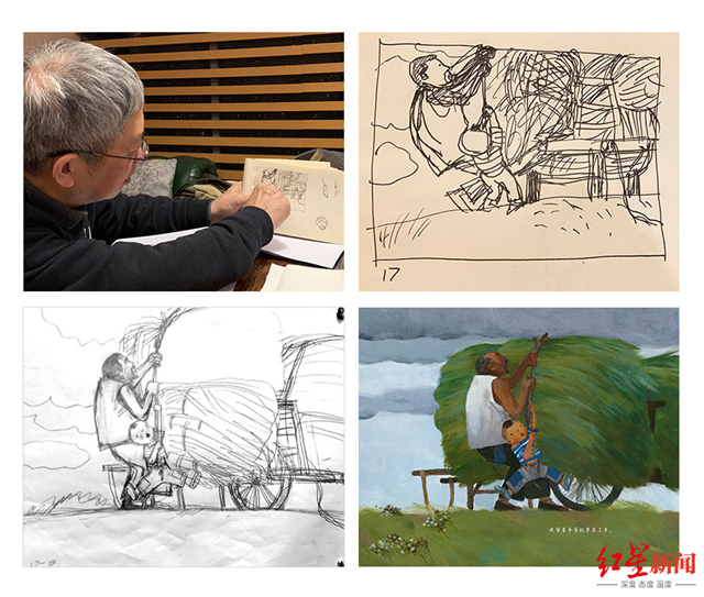 朱成梁提出了許多需要確認(rèn)的問題:故事發(fā)生的時節(jié)?房子是什么樣式?院子里都有什么?旁邊有沒有菜地或農(nóng)田?里面都種了些什么?爺爺?shù)氖滞栖囀鞘裁礃邮剑坑檬裁礃拥睦K子去捆草?草是什么樣的?大河有多寬?河堤是什么樣子的?