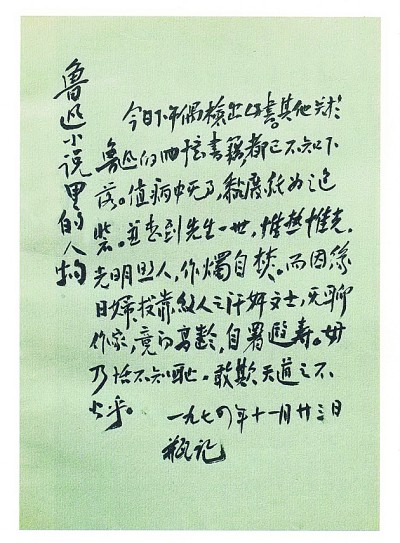 又如在《司馬溫公書牘》書衣上寫下的“世界輿論:亞洲一盞明燈熄滅了。謂周(總理)之死。強(qiáng)忍熱淚聽廣播?!北磉_(dá)對(duì)周總理逝世的傷感。