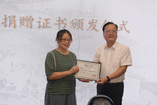 南通市委宣傳部副部長(zhǎng)、市新聞出版局局長(zhǎng)顧德華向青喬頒發(fā)捐贈(zèng)證書