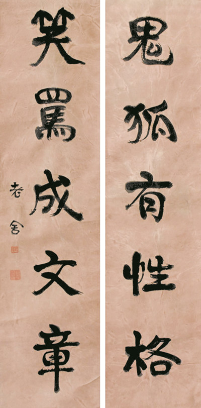 此為老舍對聯(lián),取自北碑,線條凝練厚實(shí),但用筆卻并非一路重按到底,而是起伏開張,略有《石門銘》之氣象。