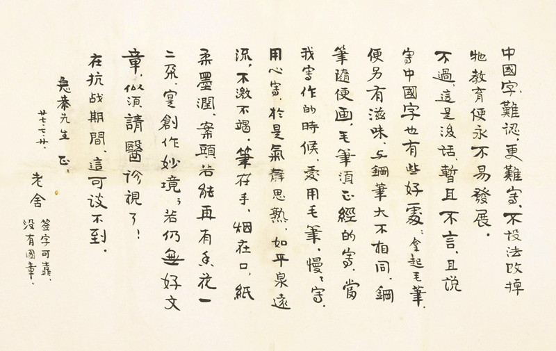 釋文:中國字難認(rèn),更難寫,不設(shè)法改掉它,教育便永不易發(fā)展。不過這是后話,暫且不言。且說寫中國字也有些好處,拿起毛筆便另有滋味,與鋼筆大不相同,鋼筆隨便畫,毛筆須正經(jīng)的寫。當(dāng)我寫作的時(shí)候,愛用毛筆慢慢寫,用心寫,于是氣靜思熟,如平泉遠(yuǎn)流,不激不竭,筆在手,煙在口,紙柔墨潤,案頭若能再有魚花一二朵,實(shí)創(chuàng)作妙境,若仍無好文章,似須請醫(yī)診視了!在抗戰(zhàn)期間,這可談不到。