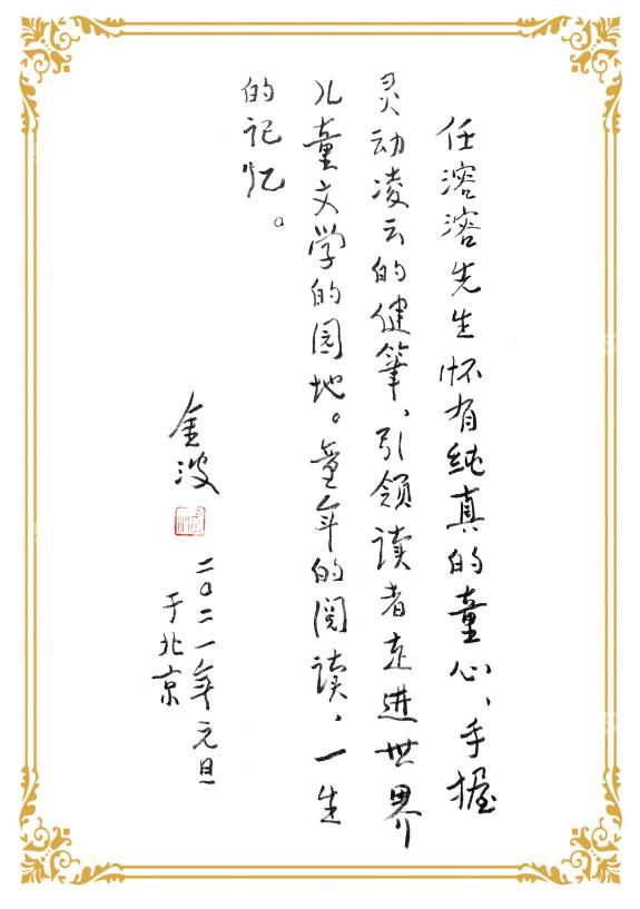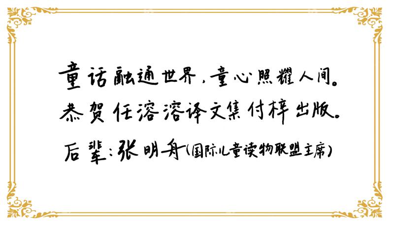 中國作家協(xié)會副主席、中國作協(xié)兒童文學委員會主任高洪波為該文集題獻:“目光四射的千萬言譯作,將人類文明的精萃,替小朋友們盡情搜羅,于是我們開心地觸摸一顆不老的頑皮靈魂,如何在語言迷宮里穿梭,童心與詩心如何鑄成不朽的快樂星座?!痹娙恕和膶W作家金波為譯文集題寫的推薦語這樣說:“任溶溶先生懷有純真的童心,手握靈動凌云的健筆,引領讀者走進世界兒童文學的園地,童年的閱讀,一生的記憶?!薄巴捜谕ㄊ澜?,童心照耀人間?!眹H兒童讀物聯(lián)盟(IBBY)主席張明舟也題詞祝賀任溶溶譯文集付梓出版。