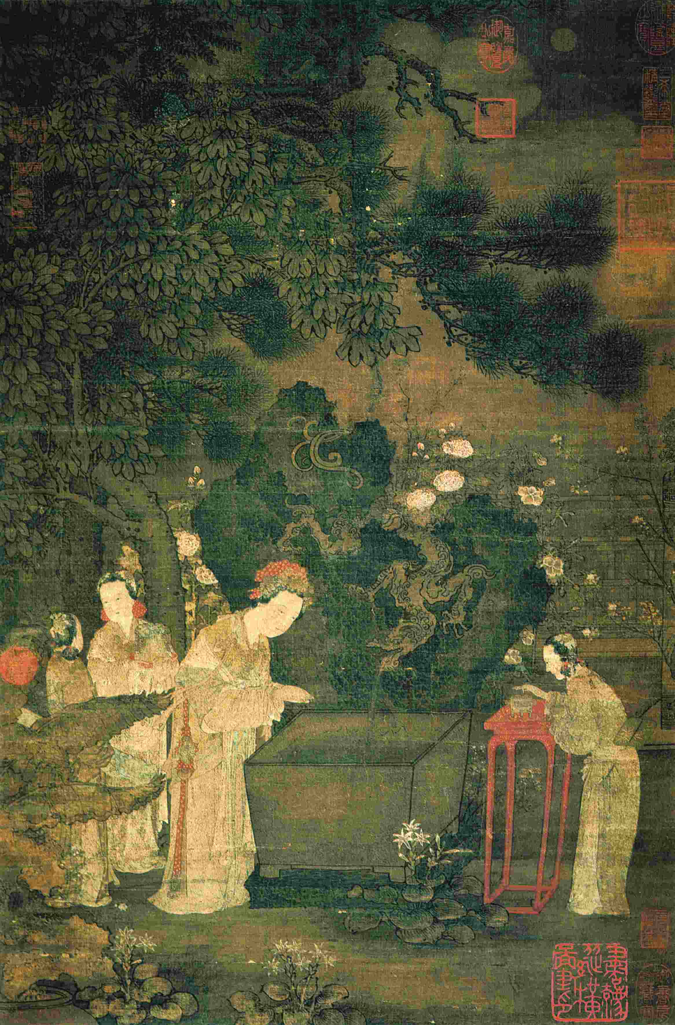 俺的《浣月圖》雖然舊標(biāo)為《五代人浣月圖》,但是好多人都不相信俺是五代的,說俺是后世托名之作。不管怎么說,俺深信留下作品比留下名字更重要,這幅畫還是很讓各位大開眼界吧:明月皎潔,高懸天際,在這幽深的大家庭院里,植物茂盛,花草芳香;盤龍踞于奇石之上,低伏向下,如同自天上而來;一線清泉噴瀉而出,池中波紋蕩漾,明月在水,女子們對(duì)池而望,焚香祈月……俺這噴水裝置有沒有點(diǎn)“黑科技”的意思?這種賞月拜月過中秋的玩法,是不是有點(diǎn)人間仙境的感覺呢?