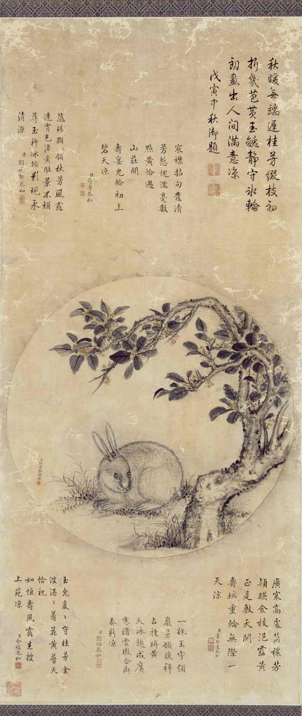 乾隆皇帝的生日與中秋節(jié)只隔1天。每年此時(shí)乾隆帝都下旨放假3天,在避暑山莊舉行月供活動(dòng),與群臣同樂。乾隆二十三年(1758年)中秋節(jié),在承德避暑山莊煙波致爽殿院內(nèi)擺月供時(shí),有供品28種。祭拜之后就是賞月、觀燈、品嘗內(nèi)廷制作的月餅,連日筵宴,熱鬧異常,而且,連同北京至承德300多里間的道邊樹木上也披紅掛彩,裝飾一新。蔣溥在壽宴上創(chuàng)作的《月中桂兔圖》表現(xiàn)的主題是圓月、桂樹、玉兔。圓月以墨筆繪就,冷月清輝,傾灑人間;桂樹的干、枝、葉也采用墨筆,其花以橘黃色點(diǎn)染,似有花香飄出,為寒月宮增添了幾許暖意;玉兔以干筆寫皮毛,焦墨點(diǎn)睛,靜臥在草叢之中,憨態(tài)可掬,活潑可愛。此畫最大的特點(diǎn)是詩書畫巧妙配合,將月中玉兔、桂樹的優(yōu)美傳說演繹得美輪美奐,烘托了中秋主題。乾隆皇帝、劉統(tǒng)勛、董邦達(dá)、劉綸、介福均等朝中大臣均在此畫題詩,君臣在傳統(tǒng)的中秋節(jié)詩書畫唱和,體現(xiàn)了君臣和諧、關(guān)系融洽,表現(xiàn)了君臣以特殊形式歡度中秋良宵的閑情雅致,也折射出乾隆盛世的文化氣象。