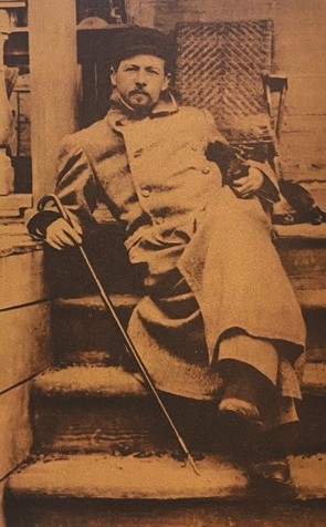 倚在門廊上的契訶夫,左手抱著他的狗,梅利霍沃,1897年