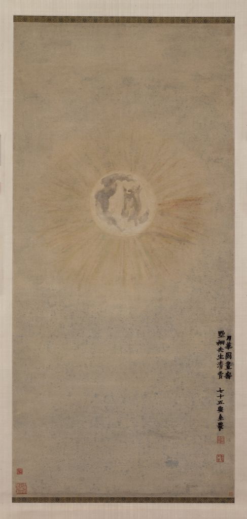 此圖是金農(nóng)晚年畫贈友人之作。全畫中只有一輪滿月,里面是凹凸起伏的陰影,外緣放射出赤橙黃綠青藍紫組成的光芒,畫面賦色簡逸純凈?!对氯A圖》的構(gòu)思則別出心裁,以寫實的手法直接表現(xiàn)月亮的光華,以奇致勝。此圖畫法上幾乎看不到傳統(tǒng)的筆墨之法,陰影的表現(xiàn)充分發(fā)揮了水墨在宣紙上產(chǎn)生的效果,與暖色調(diào)的淡色光芒形成對比,襯托出月光的皎潔明亮。張庚在《國朝畫征錄》曾評金農(nóng)畫道:“非復(fù)塵世所見,蓋皆意為之。”此圖可謂前無古人,后無來者。