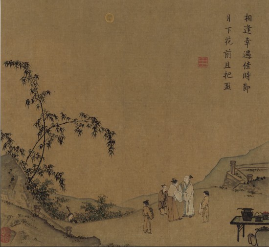 這是一幅構(gòu)圖別致意境悠遠的馬遠傳世精品,此畫雖只有一開冊頁,但畫面構(gòu)圖上小中見大,以一角或半邊景物,凸顯了山林廣大的幽然空間。畫面上還有南宋寧宗楊皇后所題詩句“相逢幸遇佳時節(jié),月下花前且把杯”。