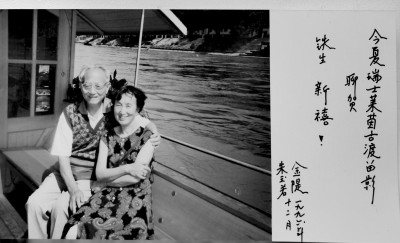 金先生是很有情趣的老先生,有一年當我打開書信,突然一張賀年卡躍入眼簾。這是金先生自己用照片制作的特殊的賀年卡,我一直珍藏著。賀卡左側是一張彩照,瑞士萊茵河畔,金先生白襯衫外套著花格背心,夫人一襲大花的紅黑相間連衣裙,老夫妻相親相愛地坐在船上,笑得很愜意、幸福。右側是空白,金先生的筆跡: