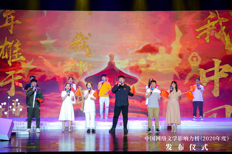 9月16日晚,中國網(wǎng)絡文學影響力榜(2020年度)發(fā)布晚會現(xiàn)場,在深圳龍崗文化中心大劇院的舞臺上,十幾個年輕人手揮著國旗,有些羞赧地唱著《少年中國說》,逐漸進入狀態(tài)后,愈發(fā)慷慨激昂的歌聲令人熱血澎湃,仿佛年輕的他們就是這首歌最好的注腳。
