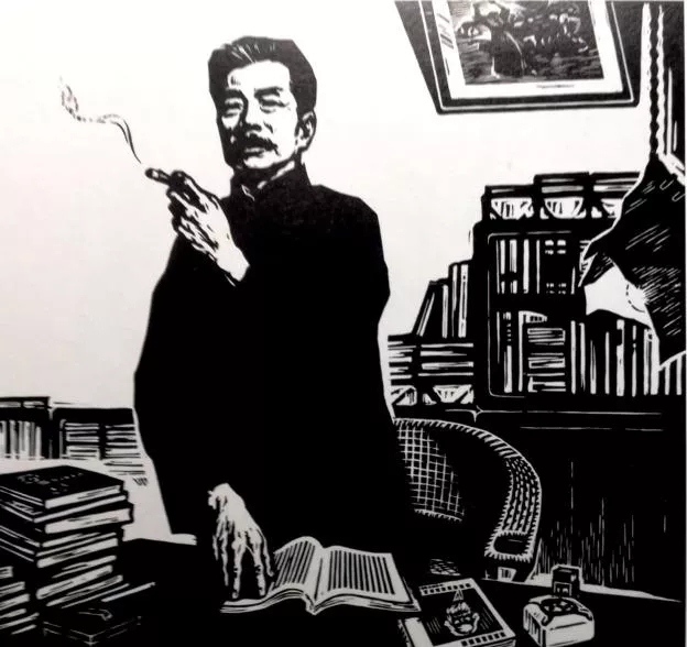 而魯迅則毋庸置疑地被樹(shù)立為了自我改造的榜樣。1951年魯迅逝世十五周年紀(jì)念日時(shí),《人民日?qǐng)?bào)》發(fā)表社論《學(xué)習(xí)魯迅,堅(jiān)持思想斗爭(zhēng)!》指出:“當(dāng)魯迅先生僅僅是一個(gè)進(jìn)化論者的時(shí)候,他的勇敢曾經(jīng)有時(shí)候伴著對(duì)于前途的迷惑。但在接受了馬克思列寧主義的真理以后,他就成了堅(jiān)決的徹底的毫不懷疑的思想的戰(zhàn)士了?!盵10]知識(shí)分子的自我改造由此成為魯迅逝世紀(jì)念活動(dòng)的題中之義。既然魯迅的自我改造是在馬列主義的指導(dǎo)下實(shí)現(xiàn)的,那么在美術(shù)家的筆下,魯迅作為自我改造模范的形象一定和馬列主義有密切的關(guān)聯(lián)?!墩J(rèn)真學(xué)習(xí)馬列著作》(圖7)這幅油畫(huà)描繪的即是魯迅學(xué)習(xí)馬列著作的情景,畫(huà)面中魯迅劃燃火柴準(zhǔn)備點(diǎn)煙,火柴已經(jīng)燒完了半截,然而魯迅的目光卻依舊被桌子上攤開(kāi)的書(shū)所吸引,遲遲不能移開(kāi)。這個(gè)瞬間極為生動(dòng)地表現(xiàn)出魯迅學(xué)習(xí)馬列著作的認(rèn)真和投入。進(jìn)一步地,能讓煙不離手的魯迅“廢煙忘點(diǎn)”的馬列著作,無(wú)疑具有巨大的價(jià)值和魅力,對(duì)魯迅產(chǎn)生著深刻的影響。李以泰的木刻《馬克思主義是最明快的哲學(xué)》(圖8)同樣表現(xiàn)了這一主題。圖畫(huà)中的魯迅一手擎煙一手按書(shū),從容而立,凝神靜思,神情中滿(mǎn)是向往,頗有幾分沉醉于馬列著作中的微醺之色。很明顯,美術(shù)家們?cè)趫D像中表達(dá)出來(lái)的意蘊(yùn)是,只有深刻、徹底地認(rèn)同馬列主義,才能夠?qū)崿F(xiàn)思想上的轉(zhuǎn)變,真正成為黨的一份子,或是黨的同路人。魯迅就是最典型、權(quán)威的榜樣。