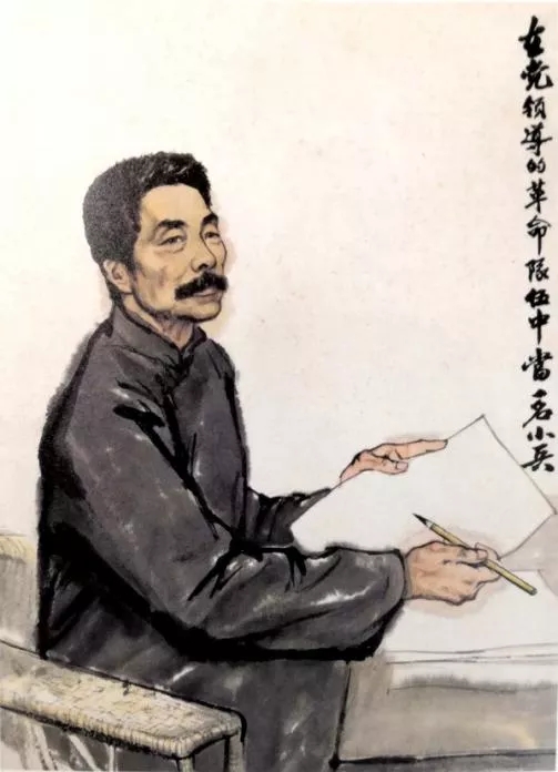 魯迅“黨的小兵”形象的塑造與馮雪峰關(guān)系甚大。1952年,馮雪峰如此回憶和魯迅相處的細(xì)節(jié):有一天“在談到了我黨和毛主席以后”,魯迅“半向著坐在書(shū)桌旁邊的我,半向著窗子,一手橫在胸前托著另一只拿著紙煙的手的手肘,只是那么柔和地默默地微笑著,然后怡然自得地、又好象忘我地、緩慢平靜地說(shuō):‘我想,我做一個(gè)小兵是還勝任的,用筆!’”[11]之后的1959年,許廣平寫(xiě)了《魯迅回憶錄》,更為明晰地刻畫(huà)出了“黨的一名小兵”的魯迅形象:大革命失敗后,魯迅“思想有了突變,從量變到了質(zhì)變,于是他否定了進(jìn)化論的偏頗,接受了馬列主義的真理,投入了階級(jí)斗爭(zhēng)的行列,他自己說(shuō)愿意在黨領(lǐng)導(dǎo)的革命隊(duì)伍中當(dāng)一名‘小兵’?!盵12]如此帶有個(gè)人感情色彩且具體細(xì)微的“回憶”,當(dāng)然不僅是回憶。因?yàn)轳T雪峰和許廣平都是魯迅的身邊人,這樣的回憶天然地具有真實(shí)感,于是,魯迅的小兵形象也就幾乎立竿見(jiàn)影地樹(shù)立起來(lái)了。蔣兆和1956年所作的魯迅像落款即是:“我想,我做一個(gè)小兵是還勝任的,用筆!馮雪峰同志回憶魯迅先生語(yǔ),一九五六年兆和?!敝芩悸斠矂?chuàng)作過(guò)相同主題的作品(圖9),畫(huà)像的題名是“在黨領(lǐng)導(dǎo)的革命隊(duì)伍中當(dāng)一名小兵”,畫(huà)中的魯迅手拿紙筆,坐于桌前,抬頭凝望著遠(yuǎn)處,似在思索如何下筆。他的神態(tài)中幾乎沒(méi)有常見(jiàn)的戰(zhàn)斗性,并充滿(mǎn)了慈和平靜以及對(duì)遠(yuǎn)方的向往。畫(huà)面沒(méi)有采取通常的仰視視角,而是選擇了容易縮小人物、表現(xiàn)人物向往姿態(tài)的略顯俯視的視角,這就不難理解畫(huà)家的在構(gòu)圖上的良苦用心了——在黨的隊(duì)伍中,魯迅就是順從于黨、聽(tīng)命于黨的一個(gè)小兵。