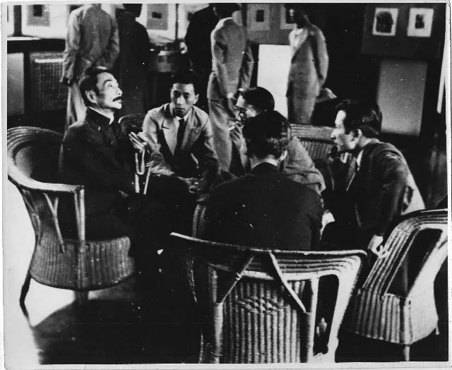 不僅如此,魯迅圖像中的場(chǎng)景也是為了更好地展現(xiàn)魯迅的權(quán)威地位而設(shè)計(jì)。在魯迅圖像中,描繪歷史事跡和特別場(chǎng)景的敘事性圖像更能引發(fā)想象,也更有內(nèi)涵空間。譬如黃永玉所作的《魯迅和木刻青年》(圖17),此畫(huà)將場(chǎng)景設(shè)計(jì)為左右對(duì)立,執(zhí)煙昂首正在講話(huà)魯迅居左,凝神靜聽(tīng)或坐或站的青年們居右。按照常理,這種左小右大不對(duì)稱(chēng)的場(chǎng)景設(shè)計(jì),重心自然在右,但這幅木刻中,畫(huà)面中心卻在左側(cè),即魯迅仍然是畫(huà)面核心。有兩方面的因素確保了魯迅的核心位置,一是青年們整齊劃一投向魯迅的目光,二是魯迅和青年們服飾上的黑白異色,使魯迅更為突出。實(shí)際上,黃永玉此作是有照片原型的,沙飛的這幅攝影(圖18)當(dāng)為其構(gòu)思底本。黃作中的魯迅形象簡(jiǎn)直完全脫胎于沙飛照片,所不同的是,黃作以藝術(shù)的手法重排了青年的空間位置,更加深刻、生動(dòng)地展現(xiàn)了魯迅的導(dǎo)師形象。