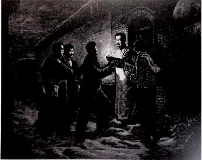 一般而言,圖像的敘事是共時(shí)的,若想在故事發(fā)生的瞬間完成敘事任務(wù)達(dá)到表達(dá)目的,就需要選取最有表現(xiàn)力的時(shí)刻。這一時(shí)刻繼承著上面故事的發(fā)展,也孕育著故事的后續(xù)進(jìn)行,也就是萊辛所說(shuō)的有“最大效果”的“頃刻”。美術(shù)家們?cè)谔幚眙斞杆诘膱?chǎng)景時(shí),選取的常常都是此種時(shí)刻,也使得畫(huà)面更能引人注目,進(jìn)而在不動(dòng)聲色間塑造起魯迅的權(quán)威形象。