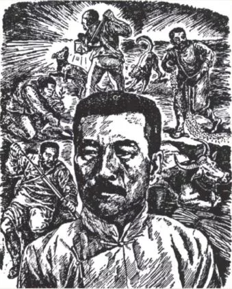 在不同魯迅圖像中具有內(nèi)在同一性的還有背景設(shè)置。背景很多時(shí)候和場(chǎng)景是并為一體的,但在非敘事性的魯迅圖像中,背景常被設(shè)計(jì)為具有特別意義的符號(hào)元素。以此,美術(shù)家們的創(chuàng)作動(dòng)機(jī)和意圖才會(huì)更顯明地體現(xiàn)出來(lái),魯迅肖像才可能得到觀(guān)者的貼切認(rèn)識(shí)和理解。在陳煙橋1948年創(chuàng)作的《魯迅》(圖21)中,神情凝重、悲憫滿(mǎn)面的魯迅背后,是舊中國(guó)底層民眾生存的慘象。橫行的狗、被縛著的人以及軍閥的槍?zhuān)荚跓o(wú)聲地控訴著其時(shí)的社會(huì)時(shí)局。魯迅的反抗性和革命性由此得以凸顯。黃新波的《心事浩茫連廣宇》(圖13)中,背景則更富政治隱喻意味。在魯迅手中作為“武器”的筆,似已幻化為了真正的槍?zhuān)瑺恳鴦倮钠鞄茫蛔笊辖谴蠓殴饷⒌奈褰切莿t明示,魯迅是在馬克思主義引領(lǐng)下的無(wú)產(chǎn)階級(jí)的一員。有了武器和馬克思主義的加持,已是權(quán)威的魯迅更是戰(zhàn)無(wú)不勝。